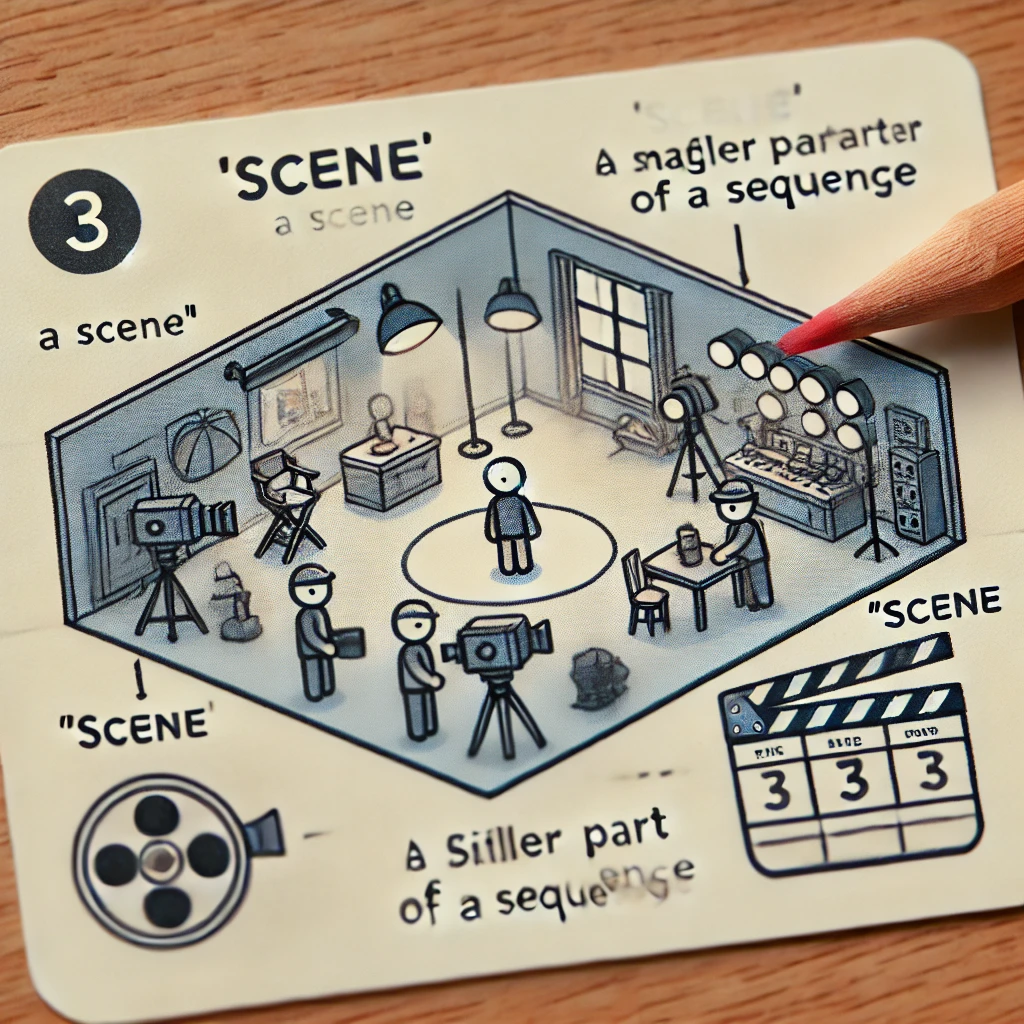 씬은 같은 시간과 장소에서 벌어지는 사건을 의미해요. 씬 안에는 여러 샷이 포함되며, 이를 통해 인물의 행동이나 대사를 통해 특정 사건을 보여줍니다.