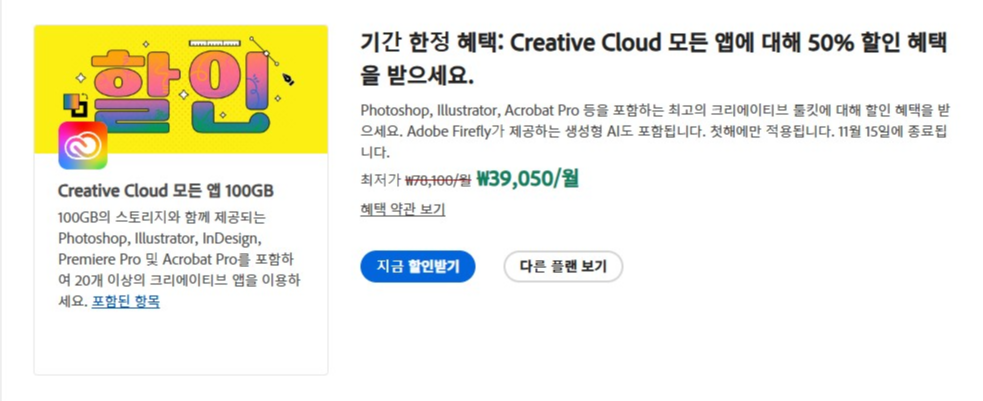 포토샵, 프리미어 프로, 일러스트레이터 같은 필수 툴을 최대 70% 할인된 가격으로 만날 수 있는 절호의 찬스! 놓치지 마세요! 😊